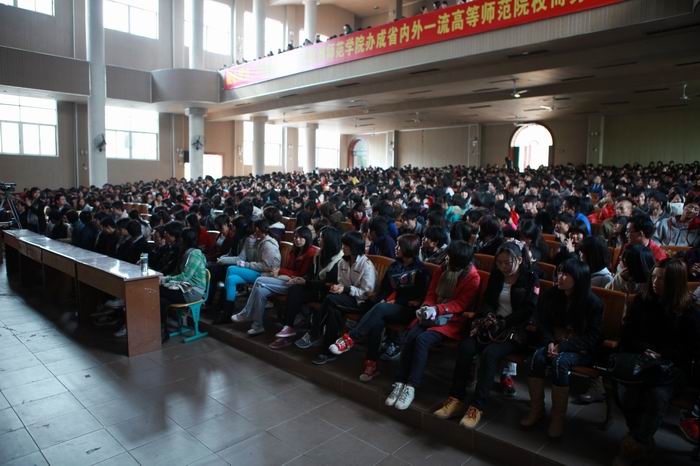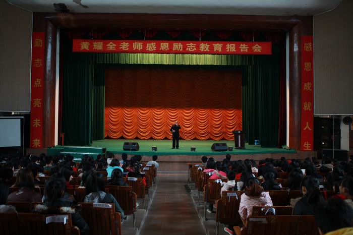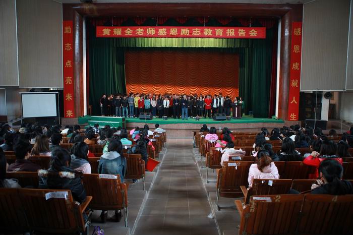 为了贯彻落实党的十七大精神,建设和谐校园文化,切实加强青少年思想道德建设,引导学生树立励志成才、感恩社会、回馈祖国的高尚品格,在我校各级领导的高度重视和学生科等部门的组织安排下,于2011年12月15日分上午、下午、晚上三个场次,在我校会堂举行了“黄耀全老师感恩励志教育报告会”。到场聆听的师生人数达5000多人。 图为黄耀全老师感恩励志教育报告会上现场 座无虚席