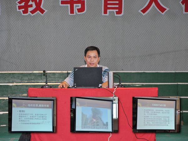 报告会中,邓增智主任以“用法律养护生命”为主题,以自己多年的办案经历和大量的现实案例,分别从“违法犯罪,摧毁幸福”和“遵纪守法,养护生命”两大方面向我们阐述了一个真理,就是:只有遵纪守法,才有幸福人生。并且通过茂名市近几年来贪腐官员违法犯罪的案例和全国大学生违法犯罪的案件,为我们剖析了他们违法犯罪的成因和危害,并告诫我们要学法、知法、懂法和守法。