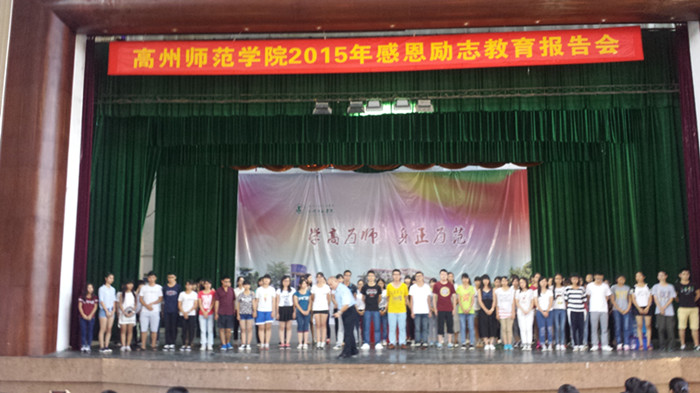 为了加强我校的德育工作,倡导心存感激的价值观念,培养学生领悟温暖的健康心态,塑造健全人格,2015年9月25日,我校在会堂隆重举行了“高州师范学院2015年感恩励志教育报告会”,到场聆听的师生约有2000人。