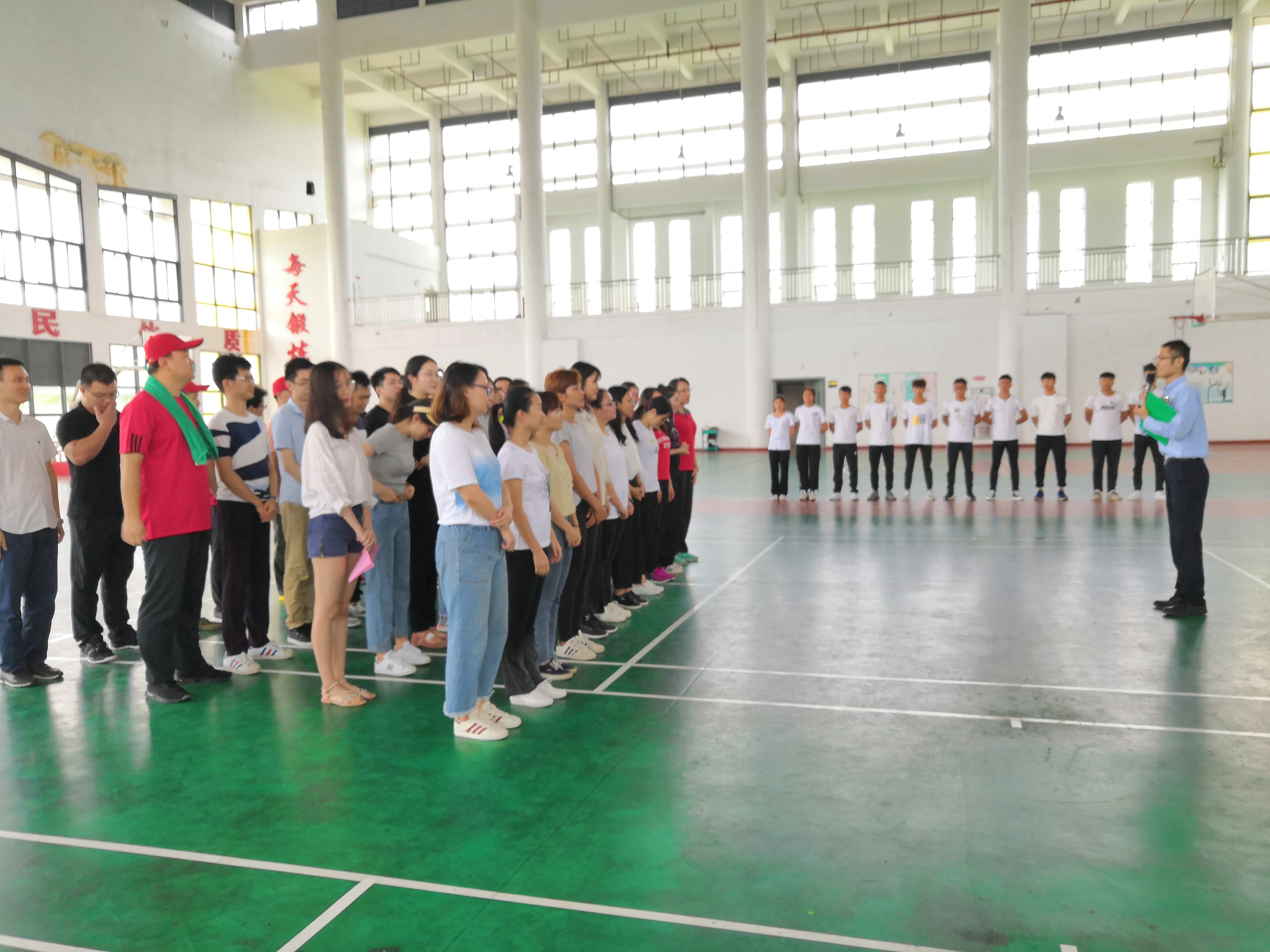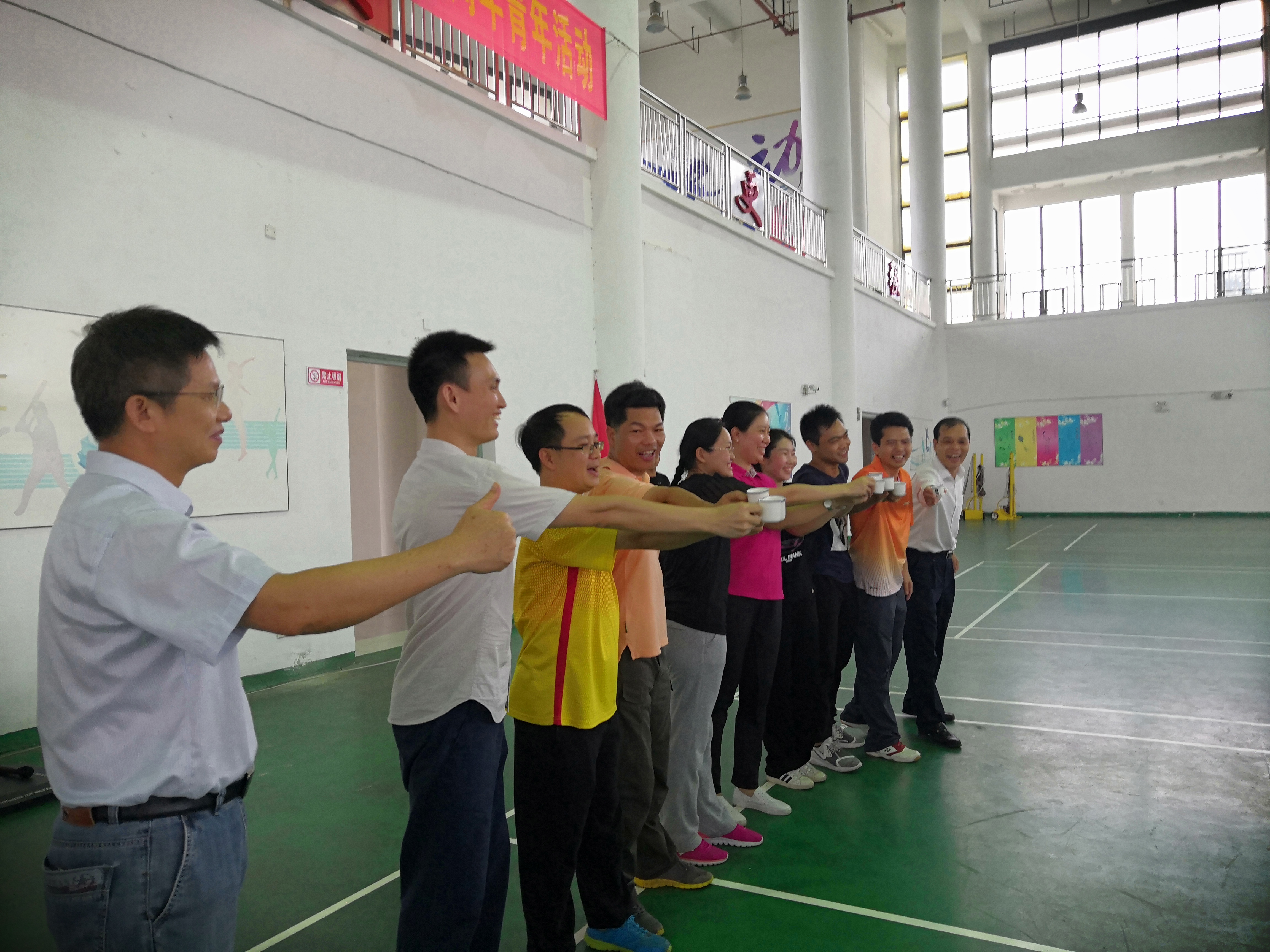 随后,我校青年教师与茂名纪检委的青年干部转移到来到体育馆开展拓展活动。拓展活动学员共分为四组,设置“能量传递”、“不倒森林”、“大河之舞”、“激情节拍”四个游戏环节依次比拼。活动过程中两单位的青年才俊摆脱年龄与身份的束缚,全程积极参与,热情高涨,好不热闹。
