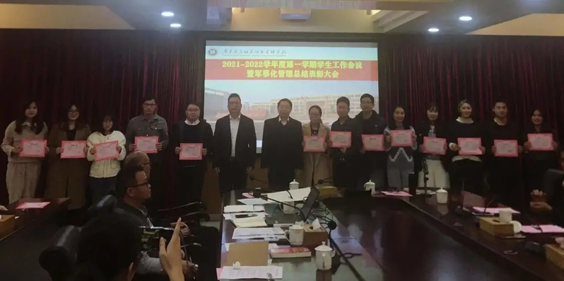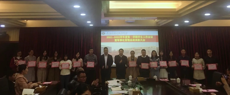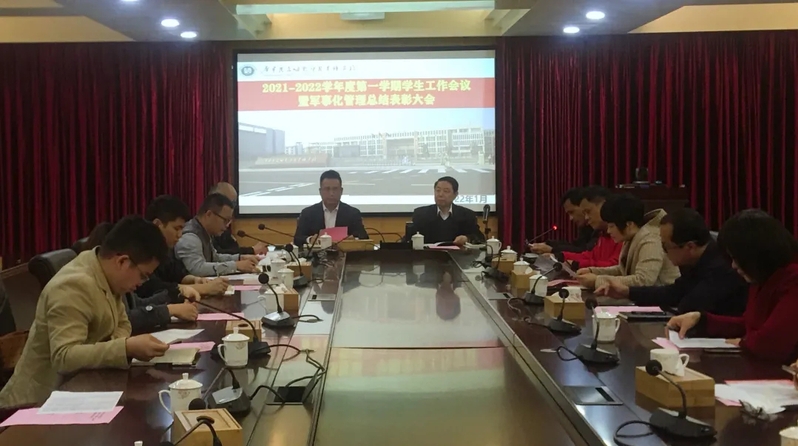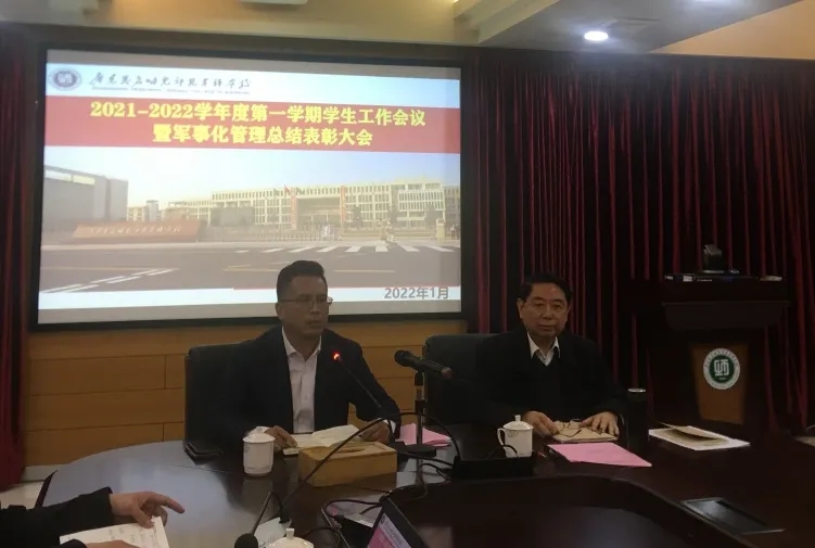 2022年1月11日晚上,我校在茂名校区三楼会议室召开学生工作会议暨军事化管理总结表彰大会,我校党委专职副书记吴月明,校长助理吕清,学生工作部部长苏文胜,副部长李德伟,学生工作部全体人员,学生军事化管理督查连连长、指导员,各二级学院领导、辅导员参加了会议,会议由学生工作部赖荣泽主持。