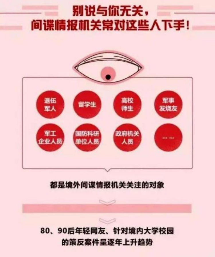 九、境外间谍关注的对象:留学生、高校学生、退伍军人、科研人员、政府机关人员等。