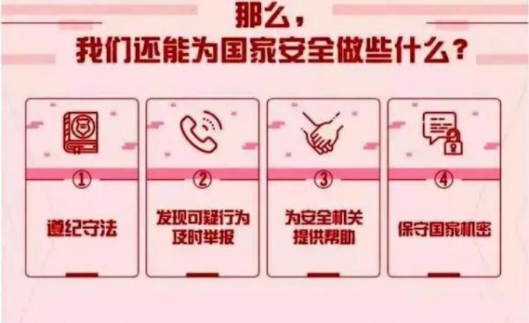 十、我们能够为国家做的:遵纪守法、发现可疑行为及时举报、为安全机关提供帮助和保守国家秘密。